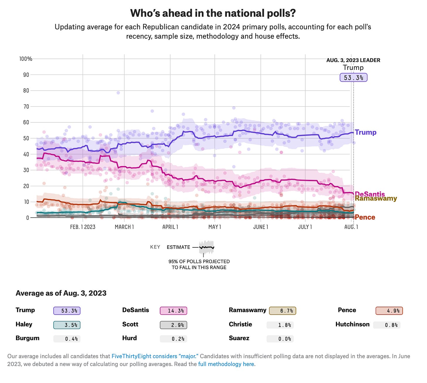 It remains to be seen if another challenger (DeSantis, Pence, Haley, etc.) will be able to close the gap in the months to come, or if the nomination is Trump’s to lose at this point.